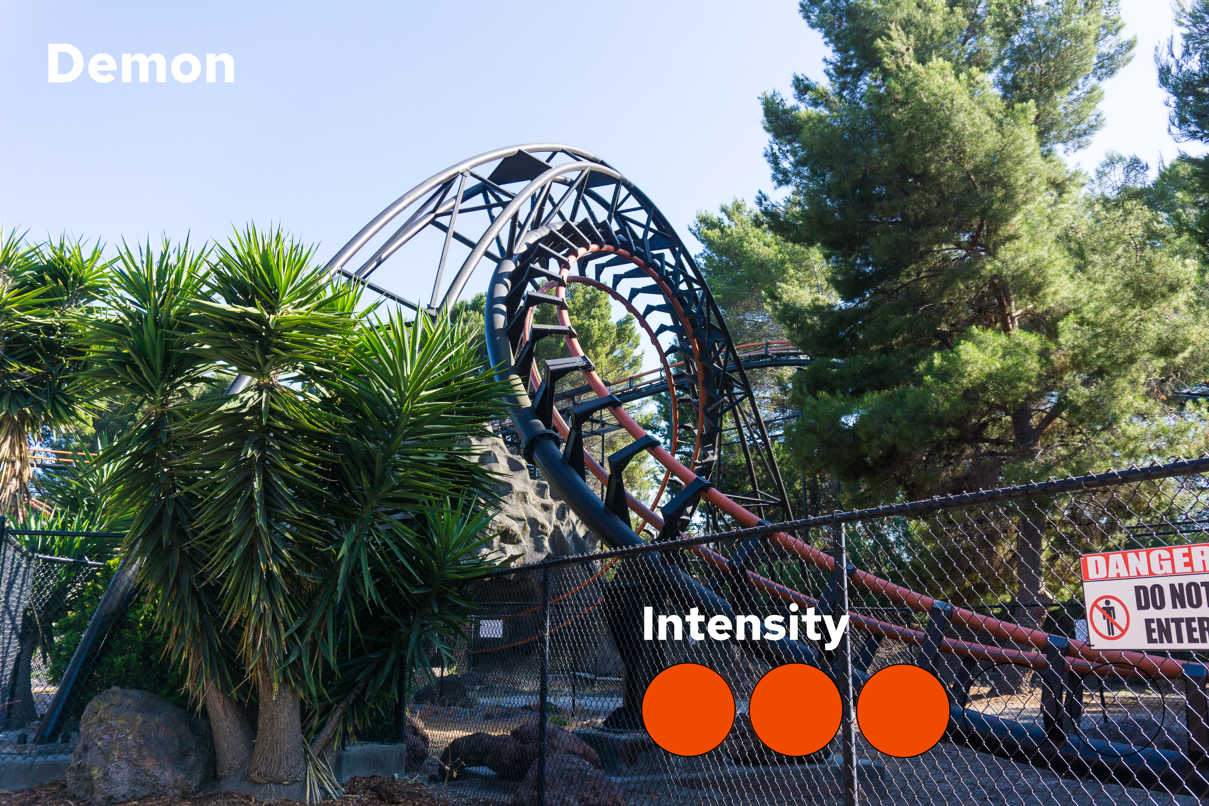 Demon gets a 3/5 intensity. Although Demon used to be one of the most intense rides in the park, Demon currently sits in the mid tier of Great America's rides. It does feature 4 inversions (2 loops and 2 corkscrews) which are somewhat intense but isn't quite as intense as Flight Deck or Railblazer. If you're more than comfortable with Gold Striker and Grizzly but not ready for Patriot and willing to go upside down, then Demon is perfect for you!